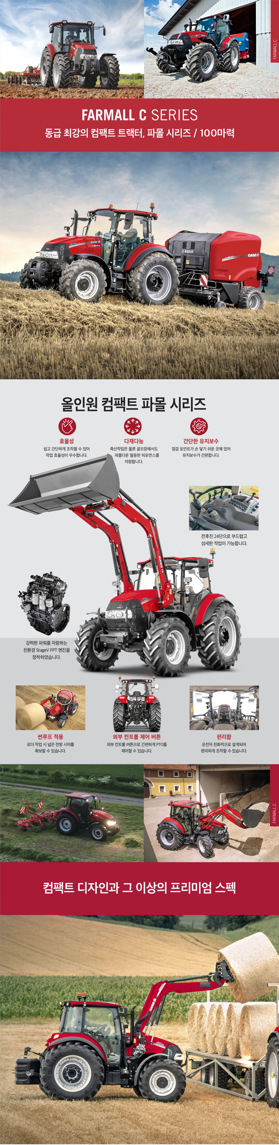 특징 제원 FARMALL C (파몰) 시리즈 축산작업 뿐만 아니라 골프장에서도 월등한 퍼포먼스를 자랑합니다. 24 X 24 Hi-Lo 변속 방식 최대출력 : 100hp FPT 엔진을 장착하여 뛰어난 엔진 효율을 발휘합니다.